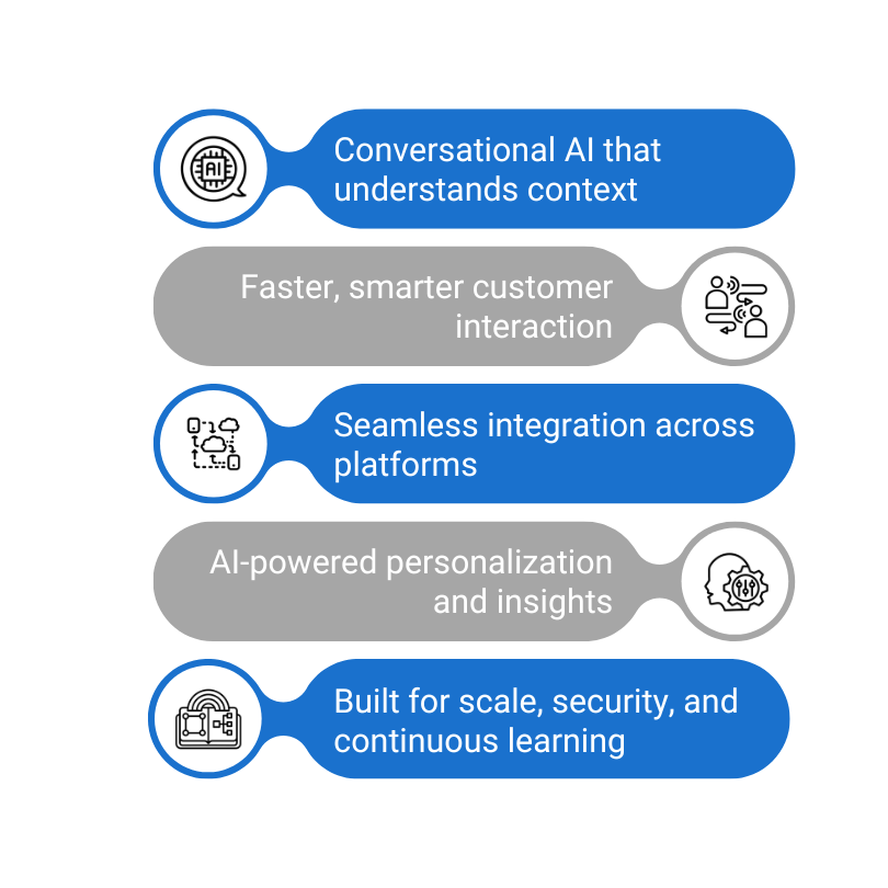 Every customer gets a consistent brand voice and a tailored experience based on past behavior, preferences, and context — powered by intelligent conversational design.
